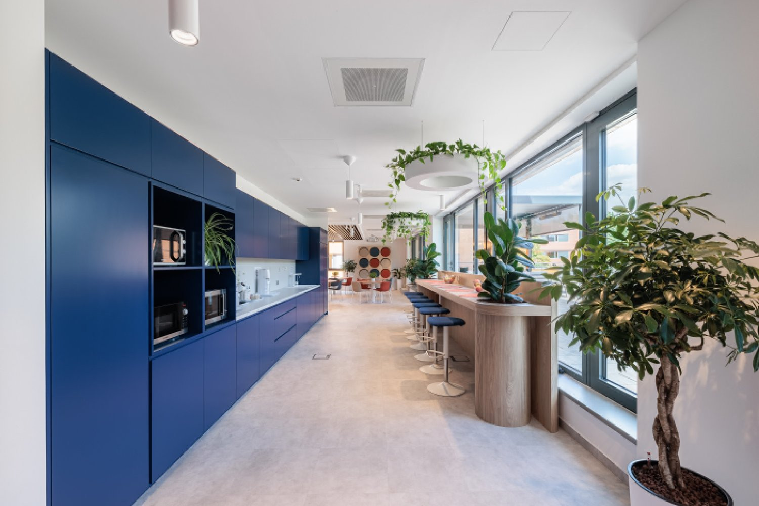Nagyon szerettem ebben a projektben azt, hogy izgalmas színeket használhattunk. A terrakotta és a zafírkék volt a két meghatározó szín és ezeket az erős színeket tompítottuk a fehérrel, világos szürkével és a tölgy egy finom árnyalatával. Amit szintén nagyra értékeltem, hogy egy biofilikus környezetet szeretett volna megrendelőnk, rengeteg élő növénnyel, ami megjelenésével az emberekben a nyugalom és otthonosság érzetét kelti, valamint javítják a levegő minőségét és pozitív üzenete van, valamint stresszoldó hatású is.
