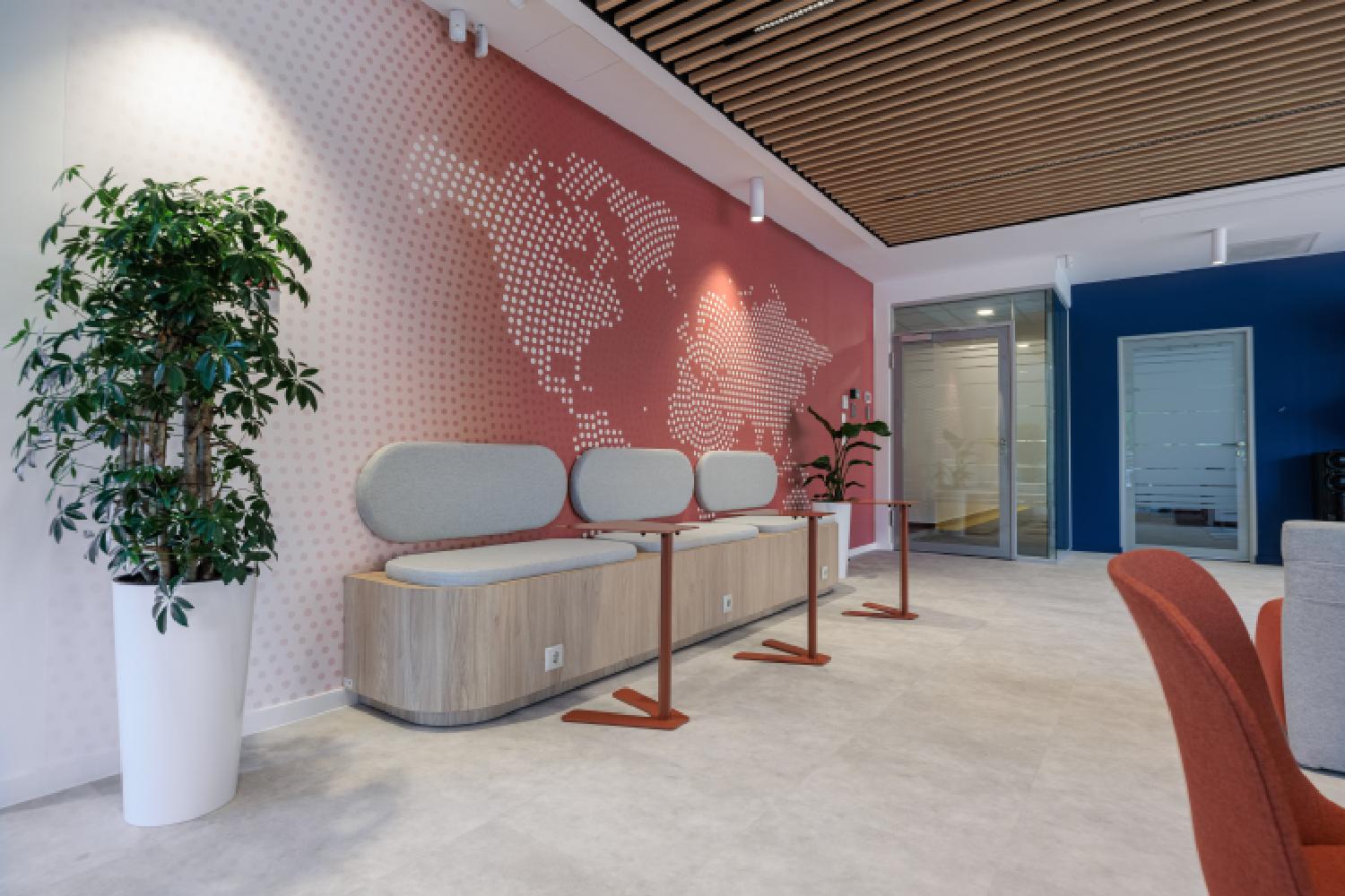 Mindenképp szerettek volna legalább két silent boxot, ami egyenként akár 4 fős tárgyalásokra is alkalmas, légkondicionált, fényerősség szabályozóval irányítható a fényerőssége és tökéletesen hangszigetelt. Esztétikailag olyan anyagokat és színeket választattunk ehhez, ami megfelel a cég arculatához és illeszkedik a folyosóra, ahol elhelyezésre kerültek ezek a boxok.