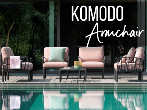 Pihentető fotel karfával, üvegszálas gyantából, párnázott elemekkel. Külön vagy a Komodo moduláris ülőgarnitúra-kollekcióban szereplő nagyobb szettek kompozíciós elemeként konfigurálható. Alkalmasak vendéglátó egységek, éttermek, kávézók, teraszok, kerthelységek, hotelek, szállodák tereibe.