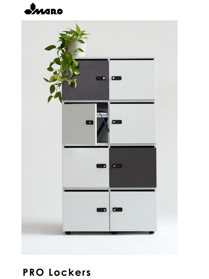 A MARO szekrények esetében a zárra fokozott figyelmet érdemes szentelni. Számos zárrendszer közül választhat, mint például: cserélhető hengeres rendszerű zárak, kombinációs zárak, kártyával, bluetooth-szal vagy ujjlenyomattal működtetett elektronikus zárrendszerek. A postázónyílásokkal ellátott szekrények lehetővé teszik üzenetek vagy posta hagyását a tulajdonos távollétében. 3 magasságú szekrény áll rendelkezésre: 3, 4 és 5OH, mindegyik 400 és 800 mm széles lehet. Mostantól mindenkinek lesz személyes helye az irodában. Minden egyes szekrényt egy-egy személyhez lehet rendelni.