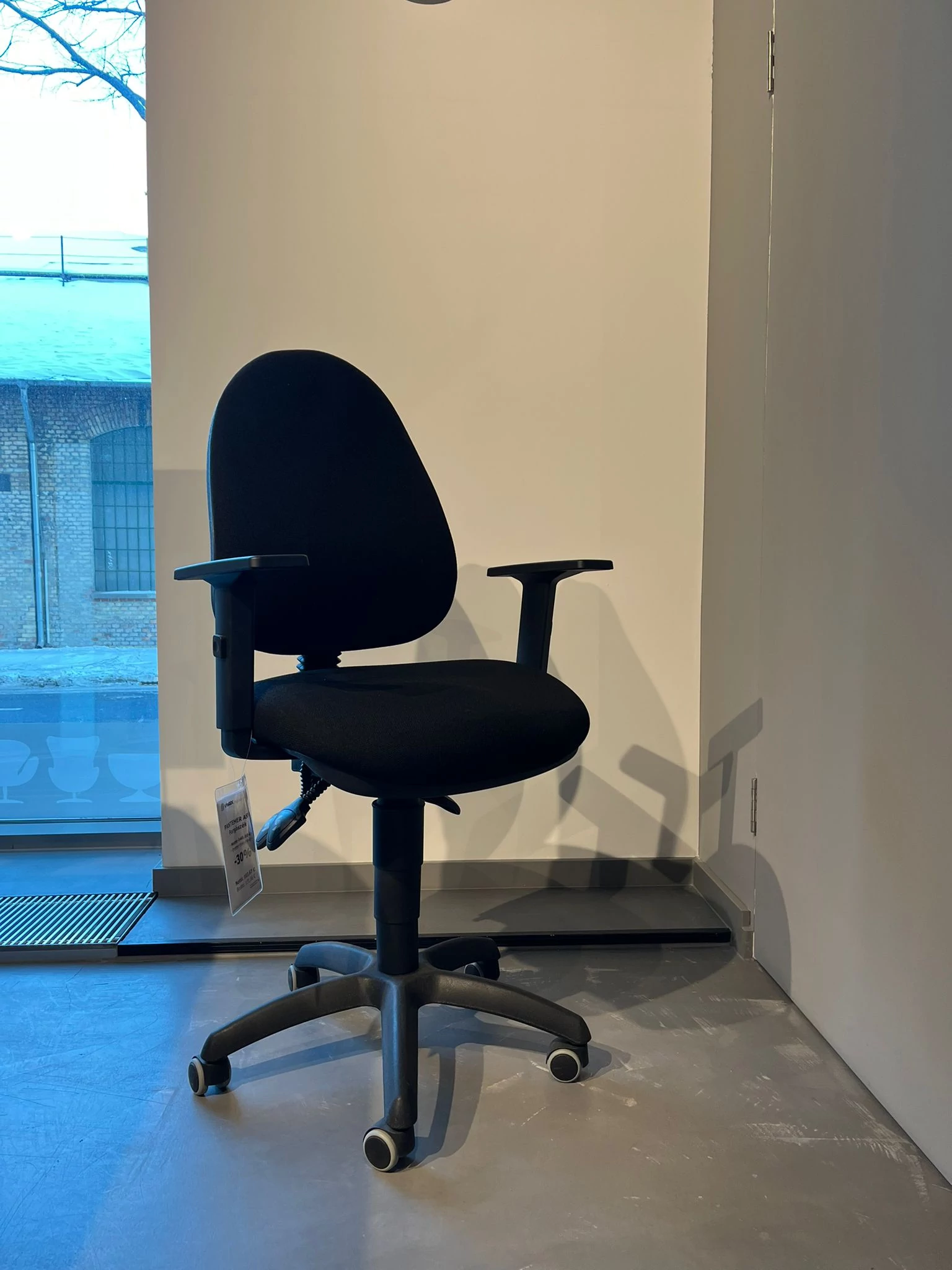 Kárpitozott forgószék fekete színben, magasságban állítható karfával.