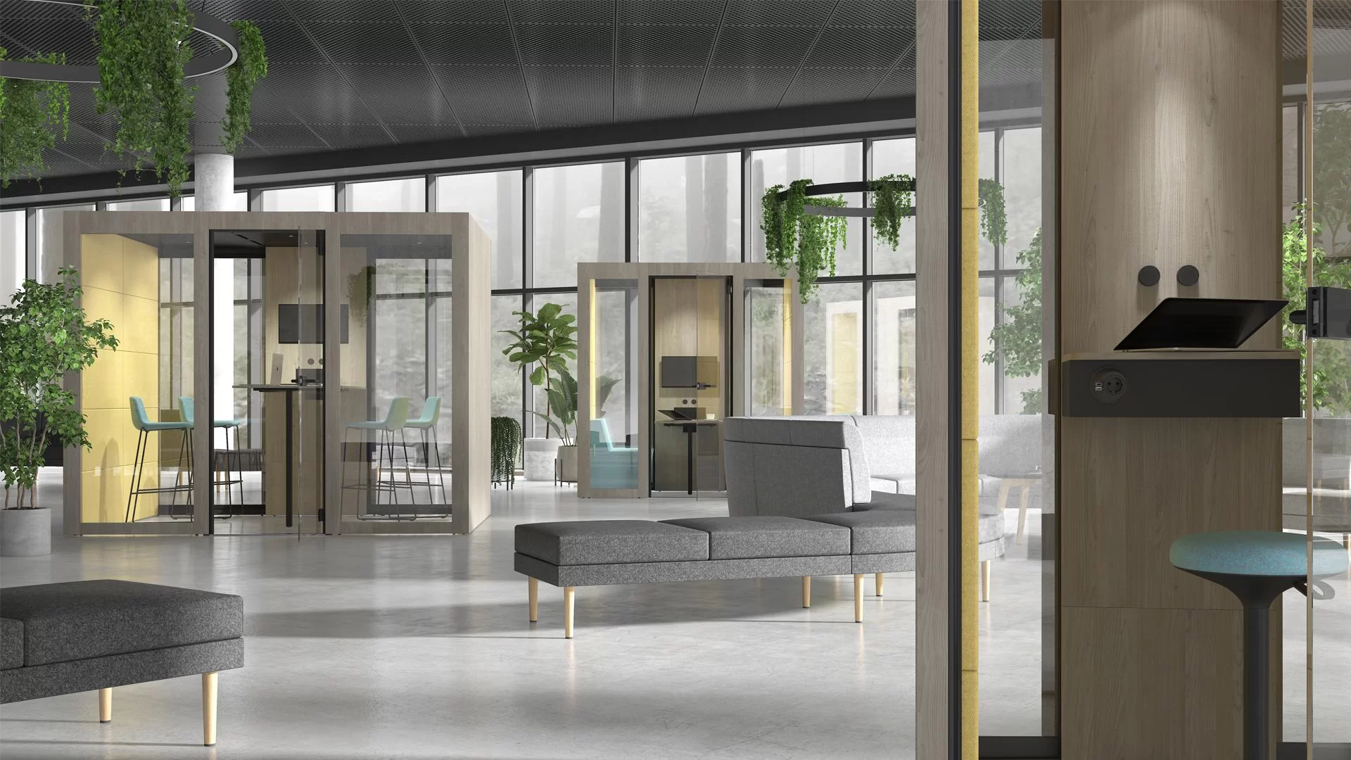 Ki-és belépni a Silent Roomban pofonegyszerű: a padlószinttel azonos küszöb miatt nem kell félni a megbotlástól vagy egyéb sérüléstől. A méreteinek köszönhetően 1,074 mm széles, 938 mm mély, 2,150 magas) a SILENT ROOM magas színvonalú komfortot biztosít és nagy mozgásteret. Többféle tevékenységre is alkalmas. Affelől is nyugodt lehet, hogy ha lemerülőben van a telefonja, akkor a fülke erőforrására rádugva a telefonját vagy okoseszközét gond nélkül folytathatja a megbeszélést. A kényelmes ügyfelek számára USB A és C típusú kiállás is megtalálható a fülkében.