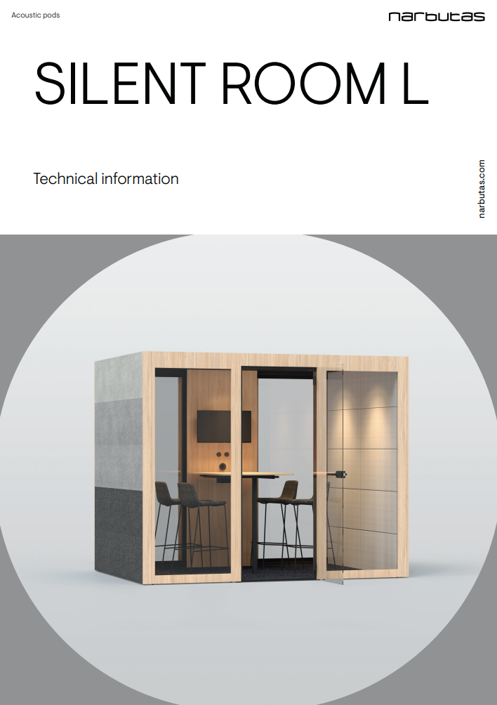 A SILENT ROOM többrétegű falszerkezete, a hermetikusan záródó ajtó és plafon gondoskodik a tökéletes hangszigetelésről. A panelek belső rétegei kiváló minőségű hangelnyelő anyagból készültek, ami megszünteti a visszhangot és kiváló hangelnyelő tulajdonságokkal rendelkezik. A kívül is kárpitozott fülke a rajta kívül keletkező, az open-space irodában terjedő hangokat is csökkenti, így akusztikailag kedvező munkakörnyezetet teremt.