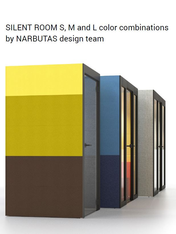 A SILENT ROOM gazdag választékát kínálja a személyreszabható munkahelyi környezetnek. A fülke külső és belső fali elemi választhatóak, ugyanúgy lehet melamin felületet választani, ahogy kárpitozott elemet is hozzá. Az elérhető anyagaink és színeink kiegészítik egymást, ezáltal egy meleg és otthonos környezetet teremtenek. A SILENT ROOM-ot az irodai bármelyik részén fel lehet állítani: az iroda közepén vagy egy fal mellett, önálló akusztikus egységként vagy más bútorok részeként is.
