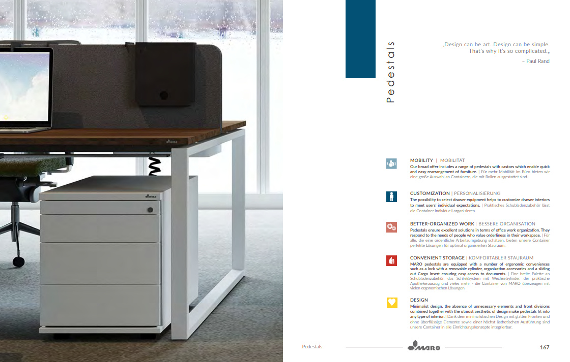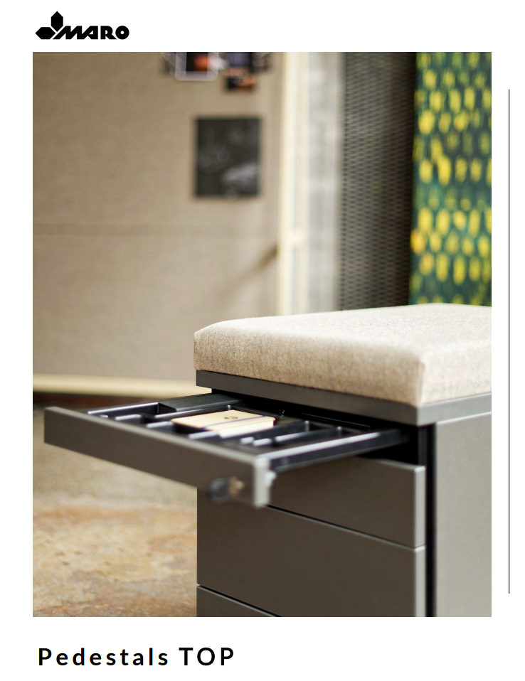A TOP konténer egy olyan kollekció, amely tökéletesen kiegészíti a MARO munkaállomás-rendszereket. Minden íróasztal funkcionális kiegészítőjeként extra munkaterületet biztosítanak. A ragasztott szerkezet biztosítja a bútor nagyfokú tartósságát, míg a több fiók egyidejű nyitását megakadályozó mechanizmus biztosítja, hogy a talapzat ne boruljon fel. A számozott zár kivehető hengerrel ellátott lágy zárású mechanizmussal garantálja a kényelmes használatot.