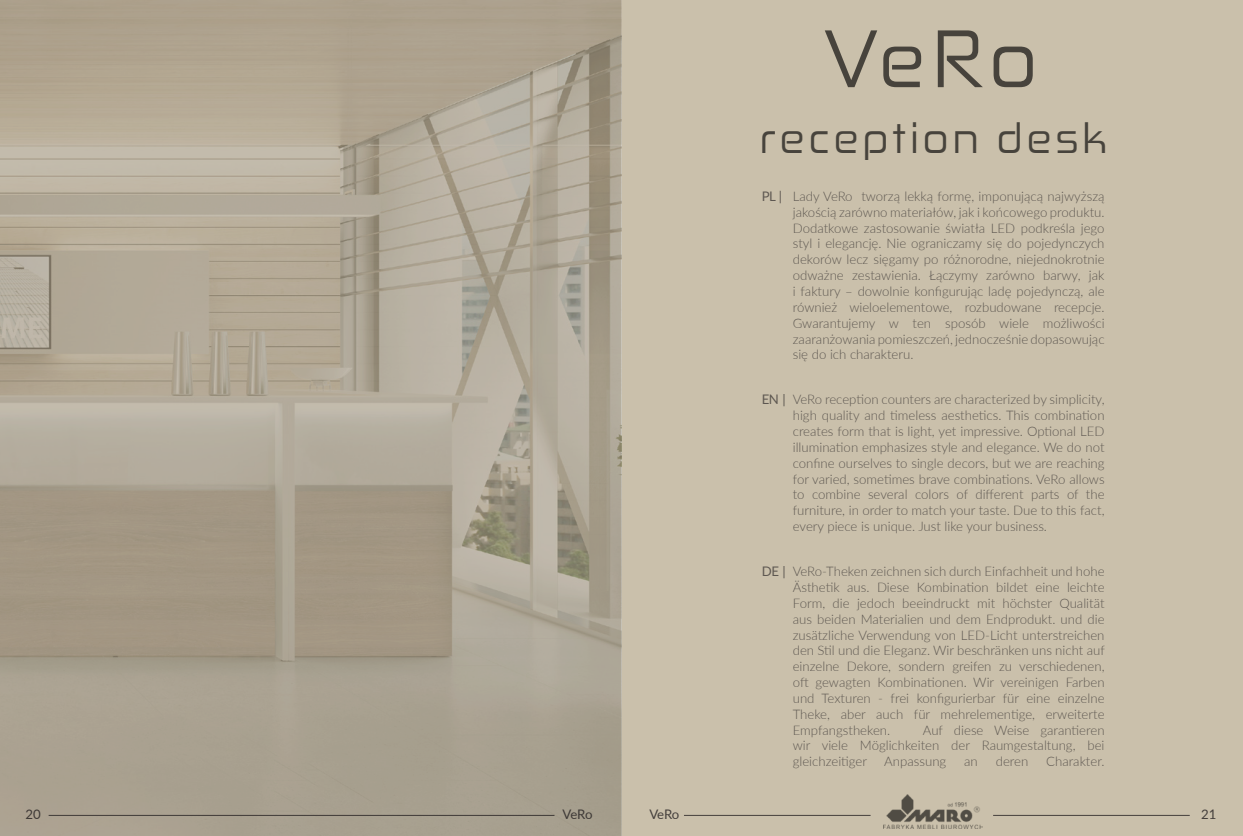 Ennek eredményeképpen bármelyik Vero szettünk tökéletesen illeszkedik bármilyen belső térbe, a kis rendelőktől a reprezentatív szállodai lobbikig vagy recepciós terekig. A LED-es megvilágítás hozzáadása kiemeli termékünk és az Ön belső terének stílusát és eleganciáját.